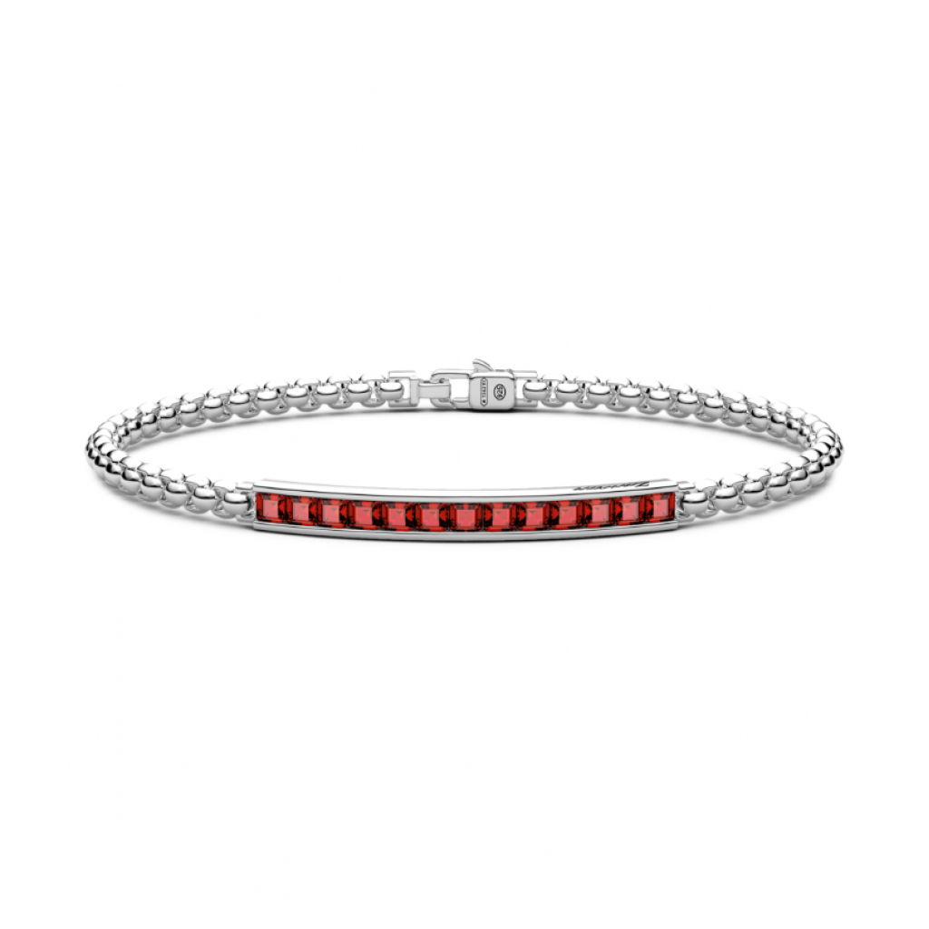 Bracciale in argento 925 design lineare con targa con pietre rosse.
