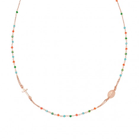 Collana in argento rose con perline colorate, medaglia e croce